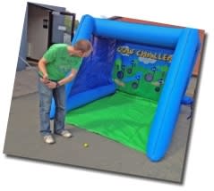Golf Chipping Game A compact indoor set up, we use an inflatable booth 2500mm wide x 1900mm high x 3000mm deep with safe, high lift drivers and balls designed for use in the booth - not on the greens, This golf chipping game can be used indoors or outside for corporate events or fun days.