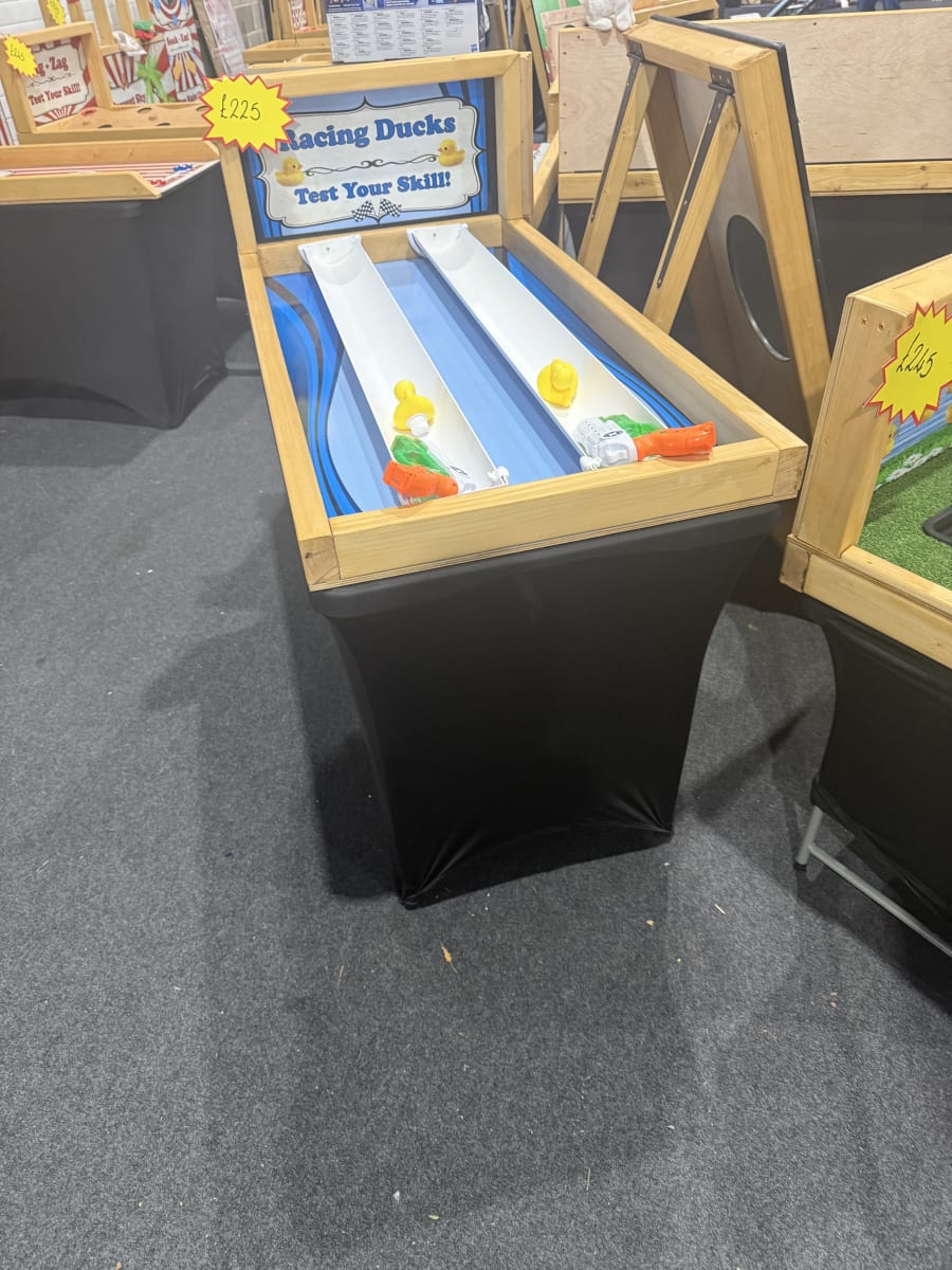 Racing Ducks Side Stall is a compact water-shooting race. Players use supplied water pistols to push a special weighted duck along a 4ft long by 2ft track. First duck to the finish line wins. Simple to run. Big on fun. Perfect for all ages. 🦆💦