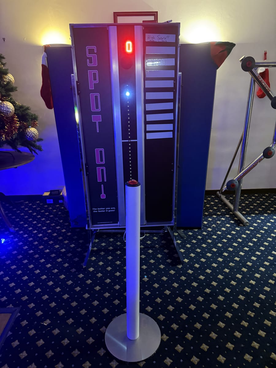 Games hire Spot on in Herefordshire,Worcestershire, Gloucestershire, wales, Oxfordshire, Nottinghamshire, Somerset, London, Birmingham, Bristol,Milton Keynes, all over the uk nation wide offers a high-energy, high-throughput challenge that keeps guests lining up. Can players stop the fast-moving light exactly on the centre spot? Everyone loves the Big Red Button. The better you are, the faster it goes. 🔴