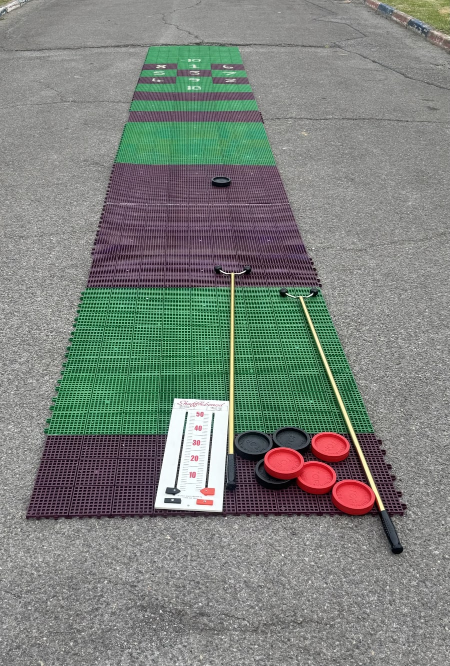 Deck Quoits, cruise ship style floor game, our hand made Quoits base features a wooden pin with 1m square target base and large wooden hoops and a marker point to throw from, a really challenging game suitable for use indoors or out, always a winner wherever we take it, 1200mm x 3000mm.