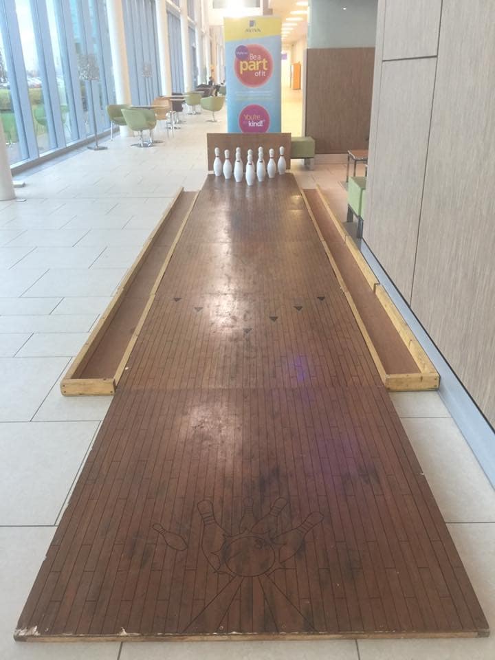 Attractive, full sized American Ten Pins with a remarkably realistic Ten Pin Bowling Ball which is manufactured from nicely weighted, deformable vinyl, complete with finger holes - feels great and plays superbly. Very safe and perfect for indoor events - all of our alleys can be branded by the way.