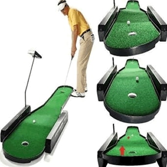Our game has 72 electronically changing contours, Two18-hole courses, two 9 hole courses on two skill levels for up to 4 players. Automatic ball return rolls the ball right to your feet after every putt.