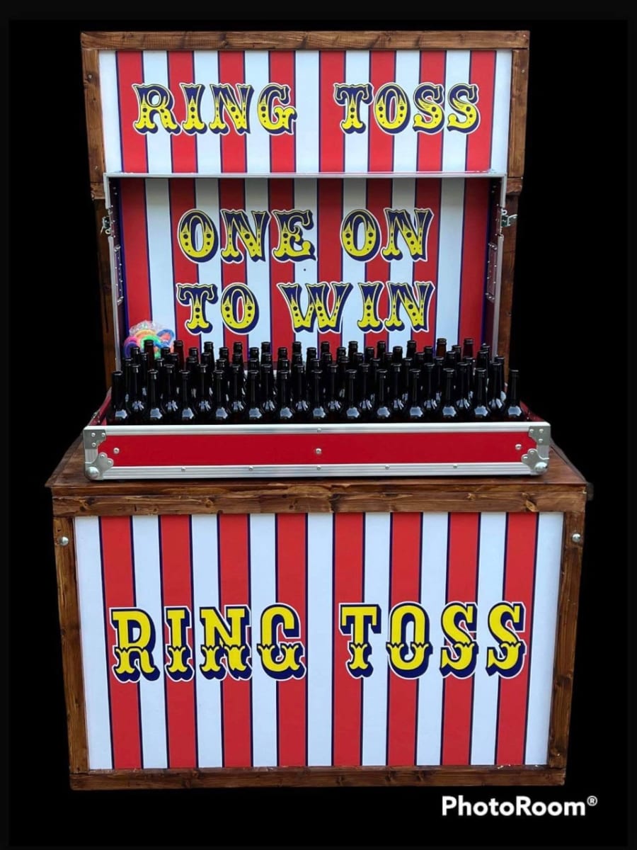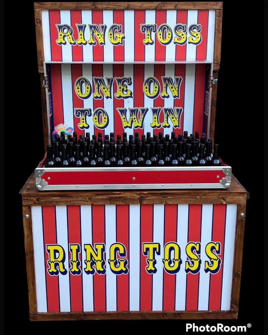 Ring Toss hire is available to hire in Oxfordshire, Gloucestershire, Worcestershire and Herefordshire. Our bottle toss fairground game will get everyone competitive trying to get one of the rings over the bottles.