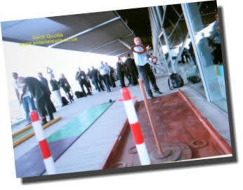 Deck Quoits, cruise ship style floor game, our hand made Quoits base features a wooden pin with 1m square target base and large wooden hoops and a marker point to throw from, a really challenging game suitable for use indoors or out, always a winner wherever we take it, 1200mm x 3000mm.