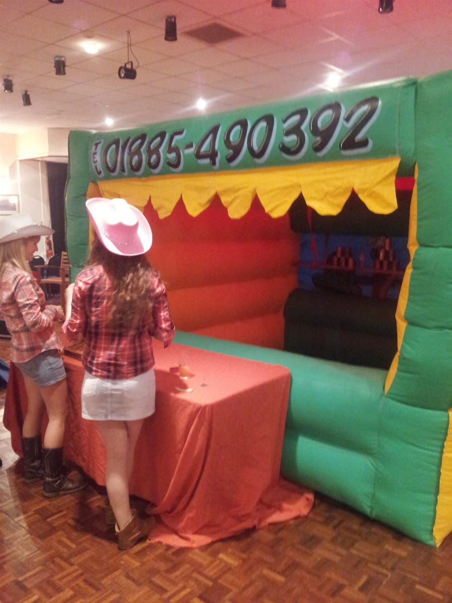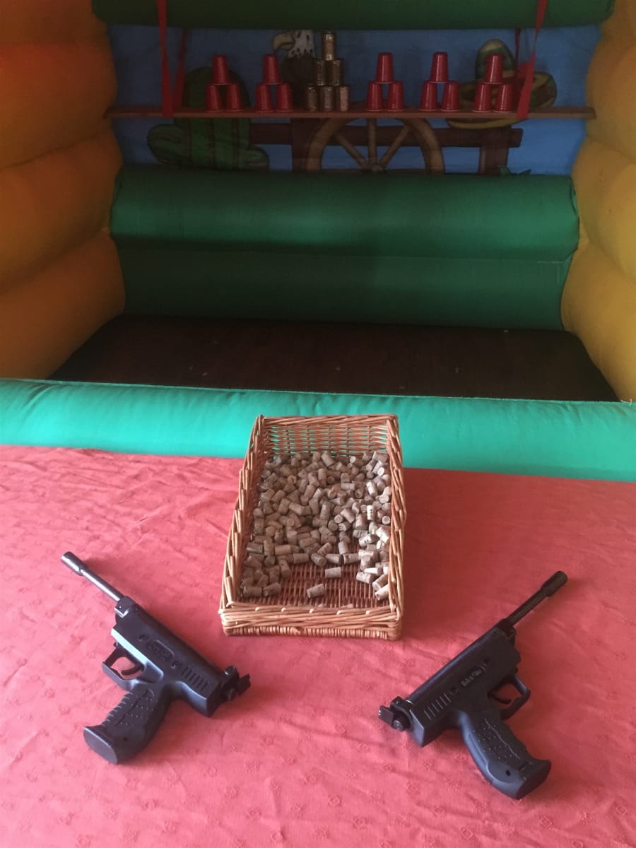 Its your choice with this great inflatable shooting range designed to our own specifications and especially developed for use alongside the Rodeo Bull. If you're a cowboy you try to shoot the cans off the range, and knock down the targets with cork guns. If you're an Indian you do the same but with a Bow and Arrow. This inflatable shooting range has been designed with safety of paramount importance and the range is fully enclosed to prevent stray arrows and corks escaping! The shooting range requires a space of 15x15ft and height clearance of 9ft.